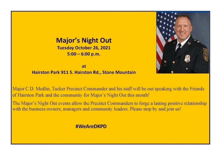 Major’s Night Out Posted by Friends of Hairston Park on October 14, 2021October 16, 2022 Major C.D. Medlin, Tucker Precinct Commander and his staff will be out speaking with the Friends of Hairston Park and the community for Major’s Night Out this month! Share this: Click to share on Facebook (Opens in new window) Facebook Like Loading... Related