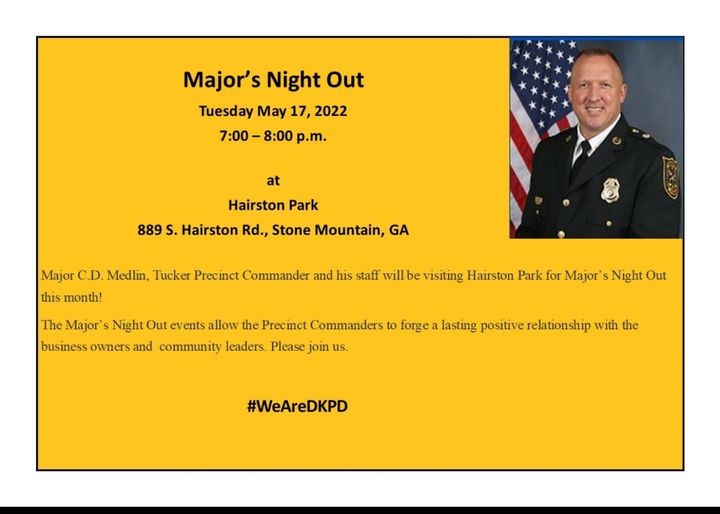 Major C.D. Medlin, Tucker Precinct Commander and his staff will be out speaking with the Friends of Hairston Park and the community for Major’s Night Out this month!
